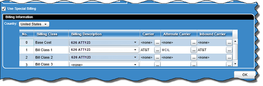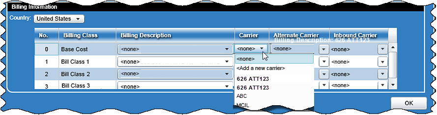 This has a drop down box that contains all the long distance services supported by the selected carrier. If the selected carrier contains only one long distance service, the drop down will be grayed out and automatically populated with the available service.