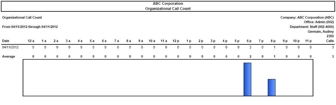 The Organizational Call Count report provides a summary of call activity made by an organizational entity (object, person or organization) for each hourly period of each day of the reporting month. It is essential to understanding and quantifying the highs and lows of usage by each organizational entity. A bar chart at the bottom of the page shows peak periods of usage during the day to aid in various resource management activities.